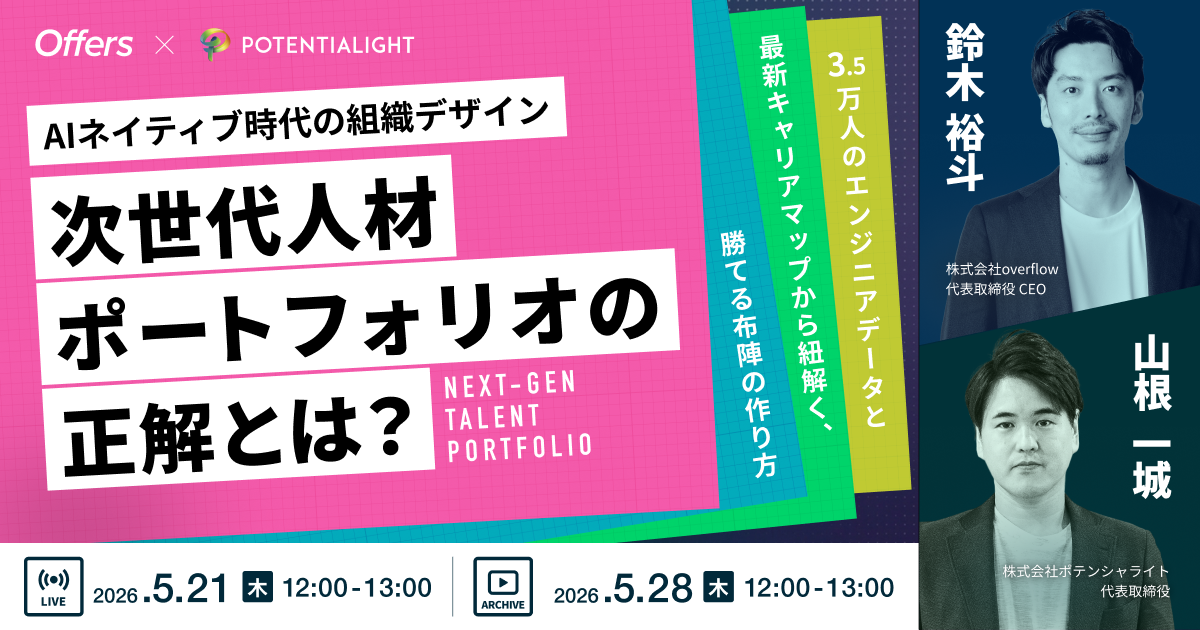 本企画では、累計500社以上の採用支援実績を持ち、AIネイティブ時代のキャリアマップを提唱する株式会社ポテンシャライトと、3.5万人のエンジニアデータから市場トレンドを俯瞰する株式会社overflowが登壇。