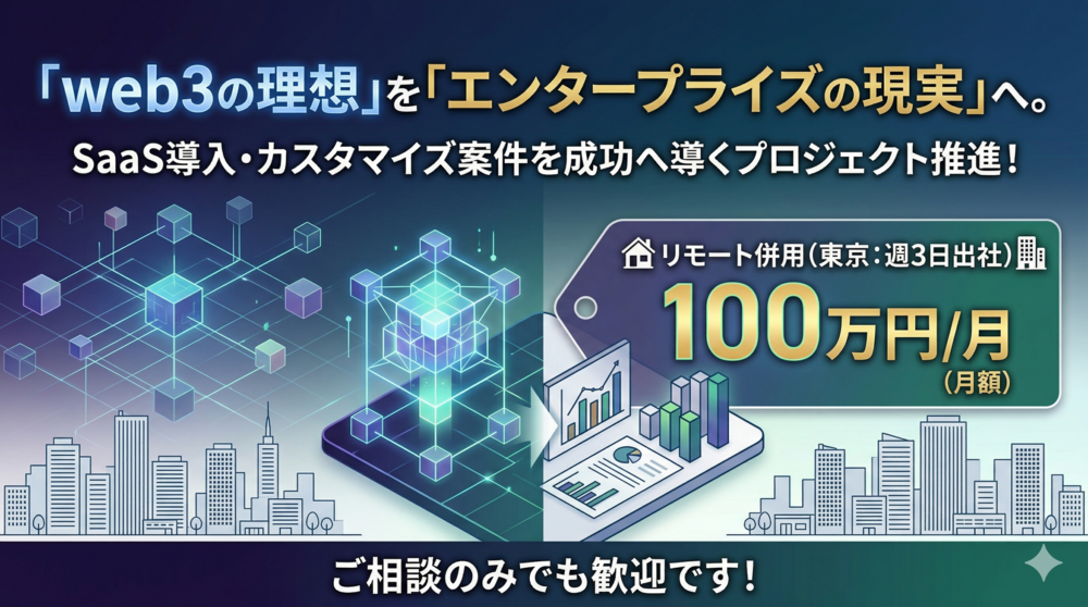 【この案件の「PM心がざわつく」ポイント】 ✨ 圧倒的なプロジェクト規模:「万博で使われる」「メガバンクが動く」といった歴史に残るweb3プロジェクトの当事者になれます。 ✨ SaaS×カスタマイズの醍醐味: 汎用的なSaaSプロダクトをエンタープライズ特有の厳しい要件にどう適合させるか。PMとしての設計力が試されます。 ✨「実用」のweb3: 投機的な話ではなく、ギフトカード交換やデジタルIDといった生活に密着した実用的なweb3ソリューションを追求できます。