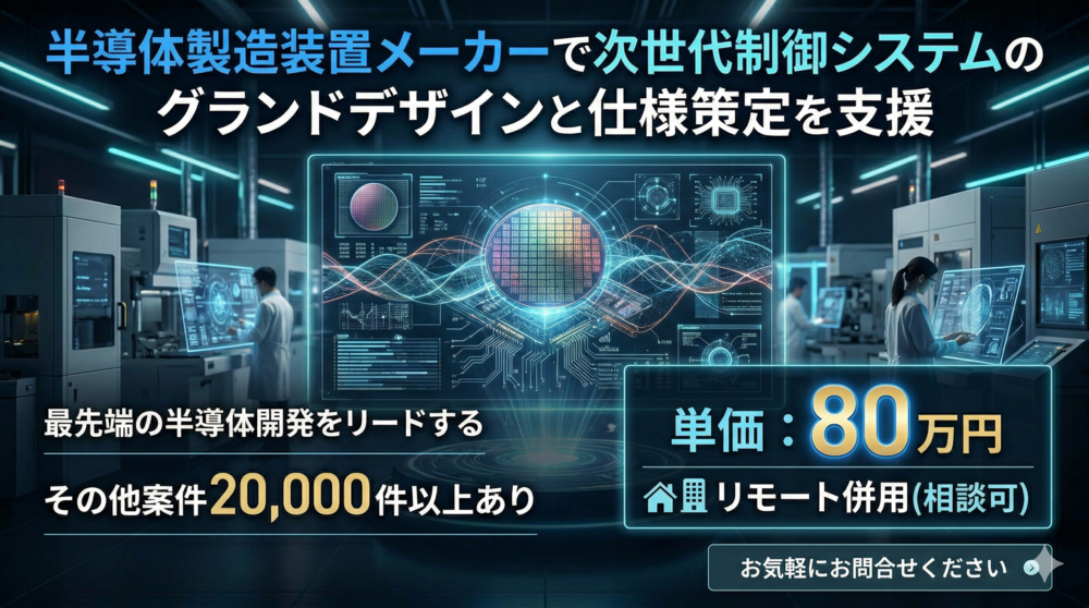 【この案件の魅力】 ✨ 圧倒的な社会的インパクト: 国家プロジェクトに携わっているという誇りと日本の半導体産業を支えている実感を日々得られます。 ✨「実装の先」のキャリアを構築: 技術的な知見をベースに要件定義やベンダーマネジメントといった、市場価値の高い「上流スキル」を徹底的に磨けます。 ✨ 最先端のドメイン知識: 今、世界が求めている半導体「後工程」の高度な製造システムに関する知識を、現場の最前線で吸収できます。