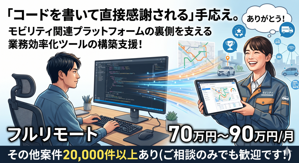 ■ 案件概要:プロダクトと現場の「ミッシングリンク」を繋ぐ 急成長を遂げるモビリティプラットフォーム。 事業がスケールする一方で、コアプロダクトの開発優先度の関係でどうしても「現場の手動運用」が残ってしまう領域があります。 そこをTypeScript/Reactを武器に暫定ツールの構築、プロトタイピング、ワークフローの自動化によって、爆速で解決していくのがあなたのミッションです。