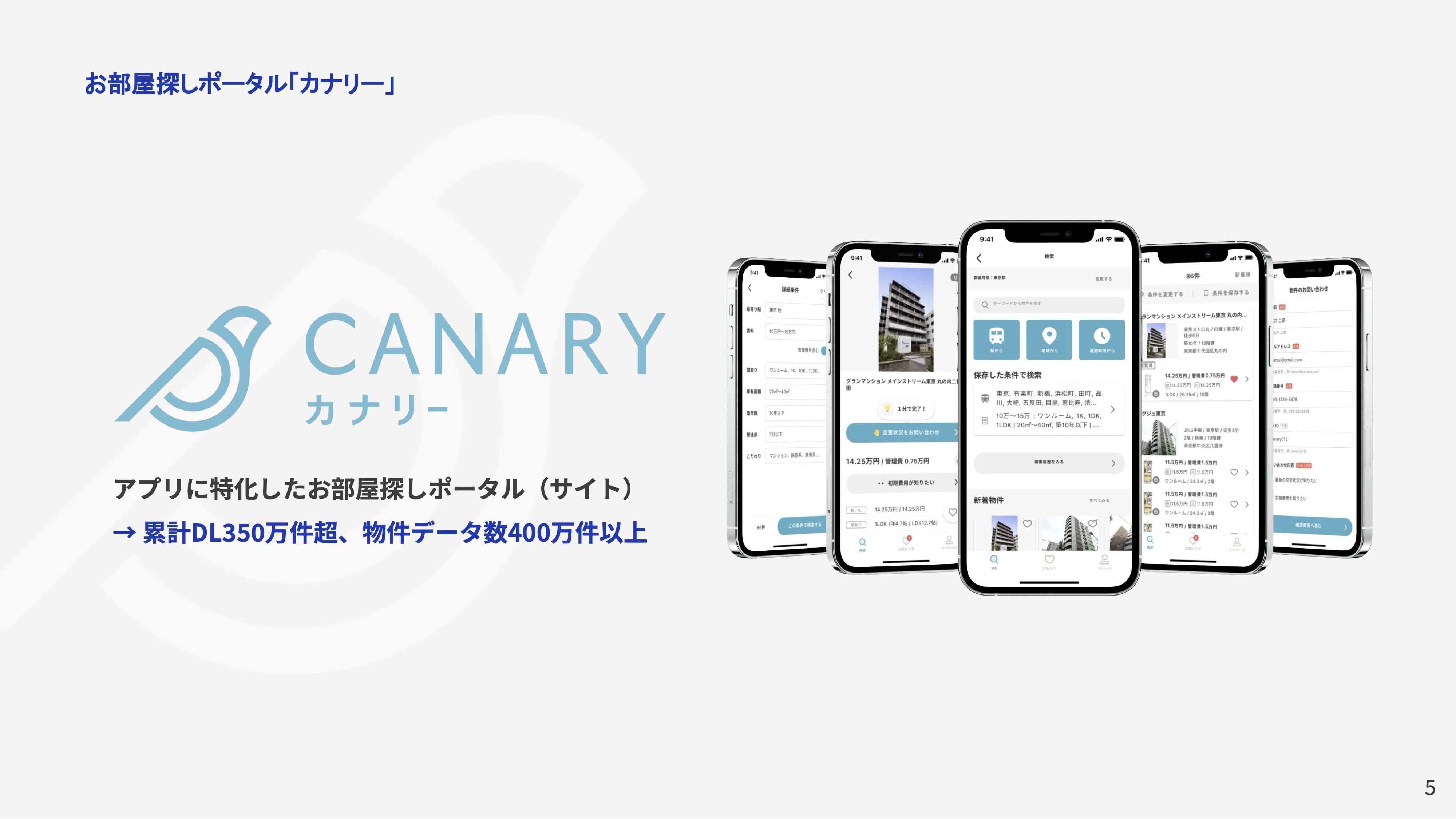 真ん中にCANARYがあって、表示する物件情報は左側の不動産の仲介会社さん(クライアント)からいただいています。