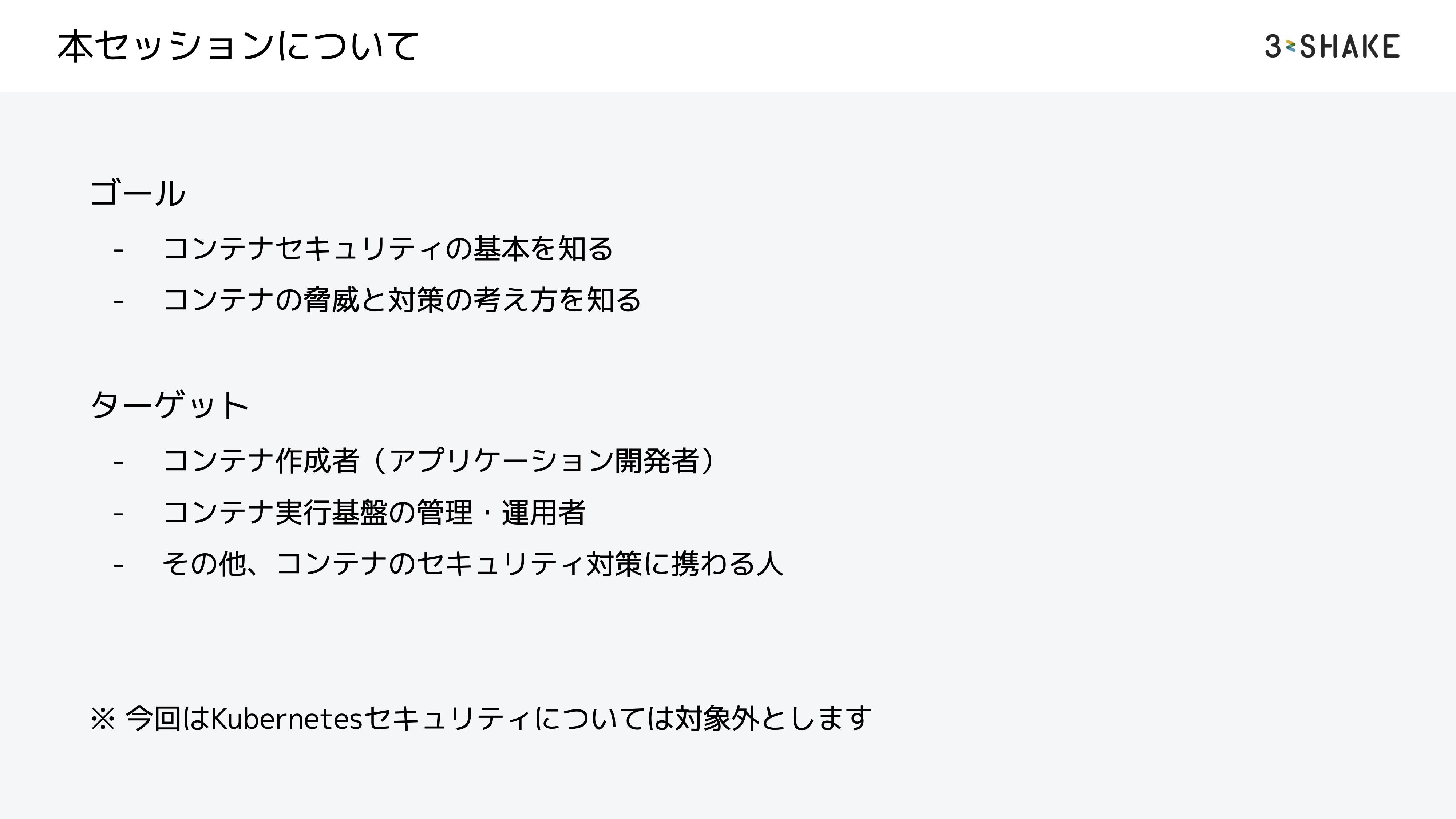 本セッションでは、コンテナセキュリティの基本について説明し、後半ではコンテナの脅威について説明します。対象は、コンテナを作成するアプリケーション開発者や、KubernetesやDockerなどのインフラを管理運用する方、コンテナのセキュリティ対策に関わる方全般です。