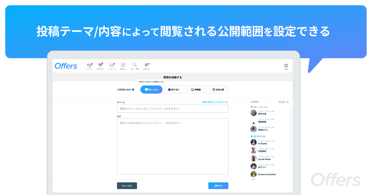 ・利用規約およびSNSシェアに関する確認事項に同意いただいたユーザーであること・質問公開範囲がOffers内にて「全体公開」に設定されていること・質問を投稿したユーザーがOffersを退会、アカウント削除していないこと・当該の質問が非表示に設定されていないこと<回答投稿の対象条件>