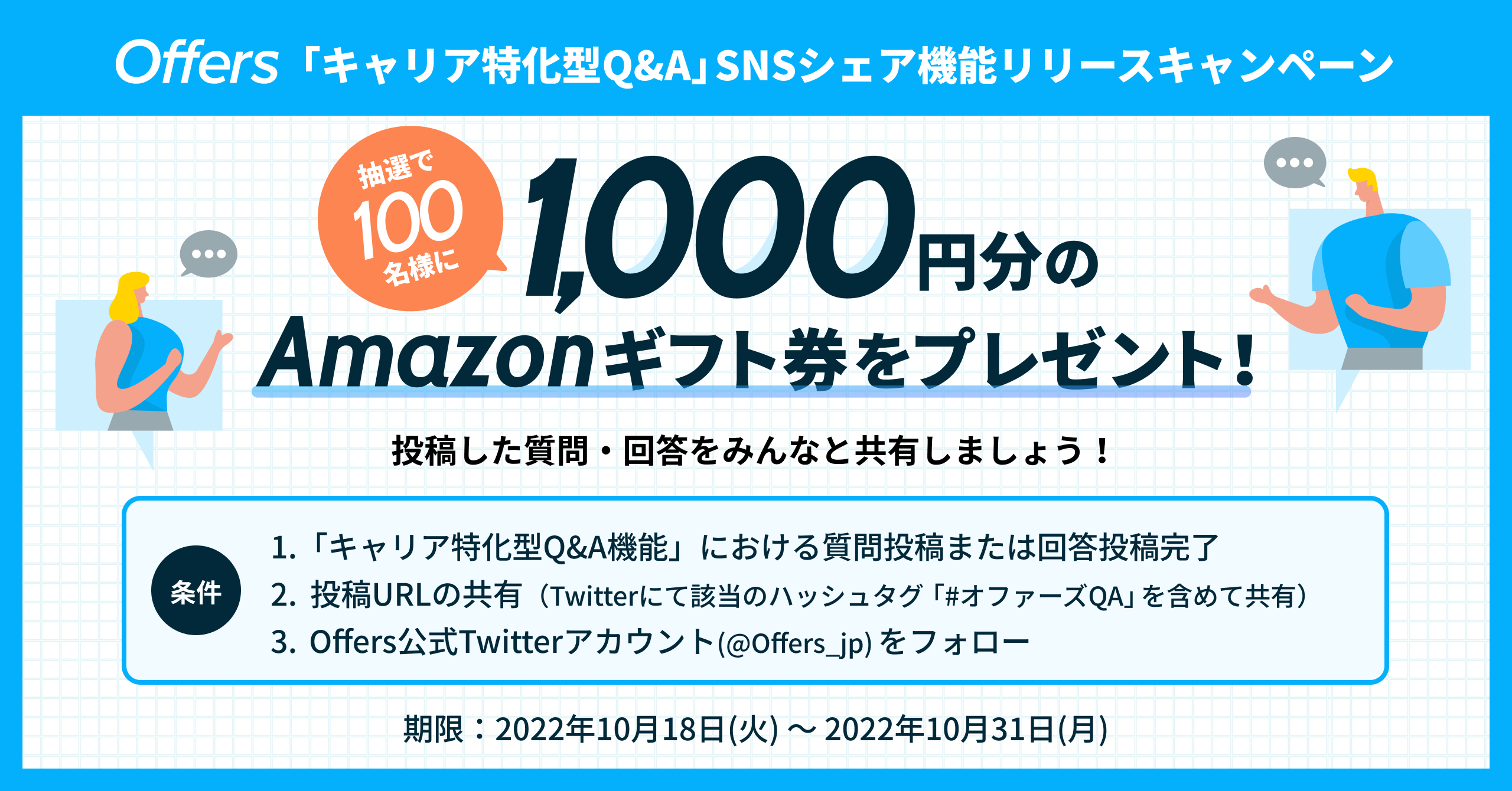 「キャリア特化型Q&A機能」へ質問投稿または回答後に、「SNSシェア機能」を利用してTwitterへシェアいただいた方の中から抽選で100名様に、1,000円分のAmazonギフト券をプレゼントいたします。