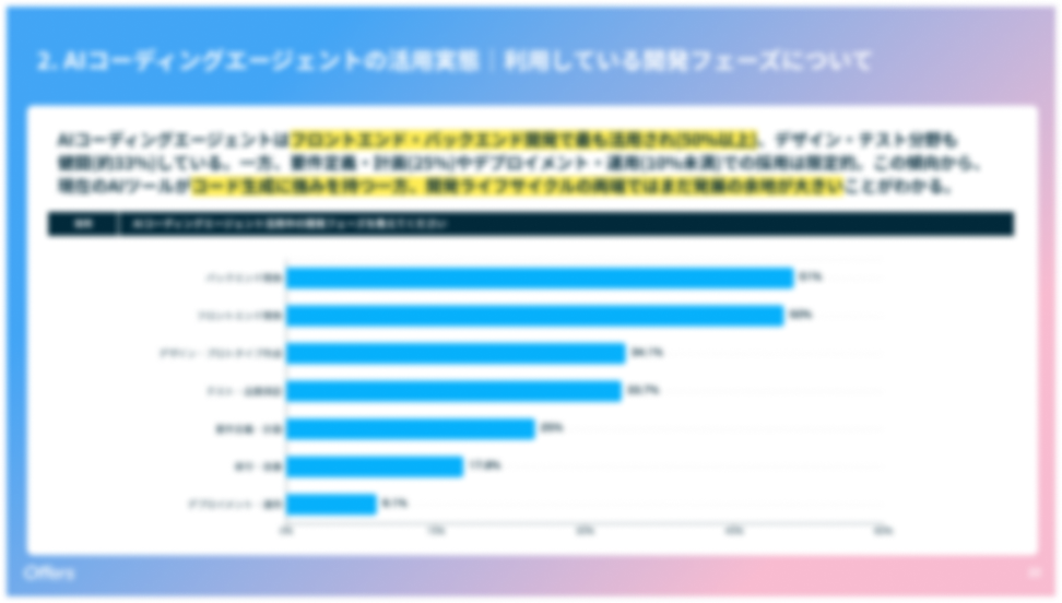 この調査では、各AIツールの利用状況や開発プロセスの各段階における効果、導入によるメリットと直面する課題について体系的に分析しています。このデータが、開発現場でAIを効果的に活用できる環境づくりの一助となれば幸いです。